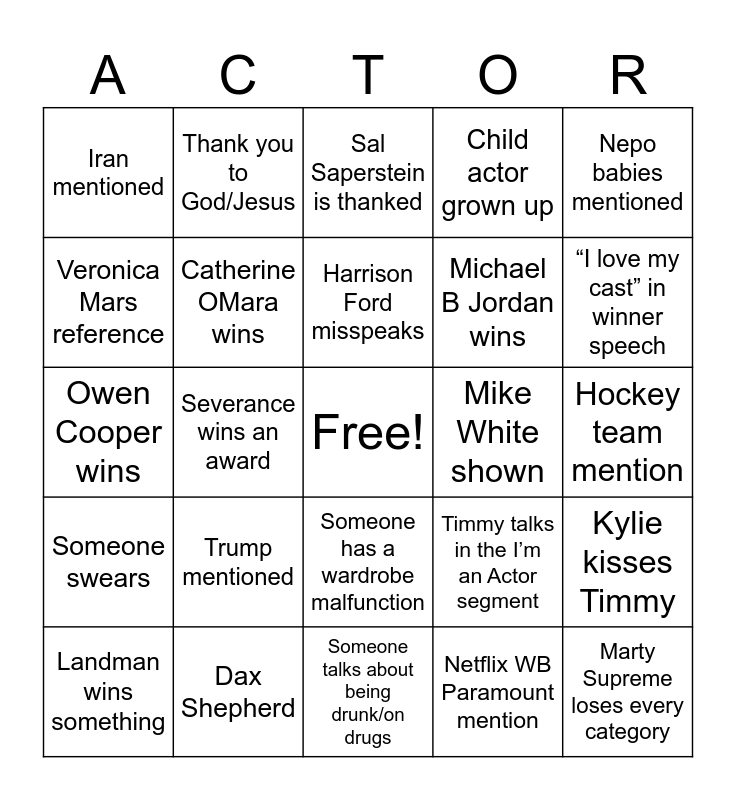 This bingo card has a free space and 24 words: Trump mentioned, Dax Shepherd, Harrison Ford misspeaks, Landman wins something, Nepo babies mentioned, Iran mentioned, Veronica Mars reference, Thank you to God/Jesus, Mike White shown, Someone has a wardrobe malfunction, Michael B Jordan wins, Owen Cooper wins, Timmy talks in the I’m an Actor segment, Kylie kisses Timmy, Catherine OMara wins, Netflix WB Paramount mention, Hockey team mention, Sal Saperstein is thanked, “I love my cast” in winner speech, Severance wins an award, Marty Supreme loses every category, Someone swears, Child actor grown up and Someone talks about being drunk/on drugs.