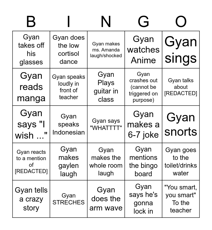 This bingo card has 25 words: Gyan makes gaylen laugh, Gyan does the arm wave, Gyan Plays guitar in class, Gyan tells a crazy story, Gyan sings, Gyan takes off his glasses, Gyan reads manga, Gyan does the low cortisol dance, Gyan makes a 6-7 joke, Gyan makes the whole room laugh, Gyan crashes out (cannot be triggered on purpose), Gyan says "I wish ...", Gyan mentions the bingo board, Gyan goes to the toilet/drinks water, Gyan speaks loudly in front of teacher, "You smart, you smart" To the teacher, Gyan snorts, Gyan makes ms. Amanda laugh/shocked, Gyan talks about [REDACTED], Gyan speaks Indonesian, Gyan says "WHATTTT", Gyan STRECHES, Gyan reacts to a mention of [REDACTED], Gyan watches Anime and Gyan says he's gonna lock in.