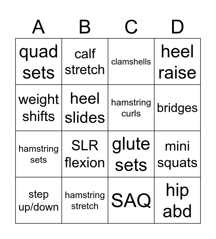 This bingo card has 16 words: hamstring stretch, mini squats, clamshells, quad sets, hamstring sets, calf stretch, glute sets, SAQ, weight shifts, heel slides, step up/down, heel raise, SLR flexion, bridges, hamstring curls and hip abd.