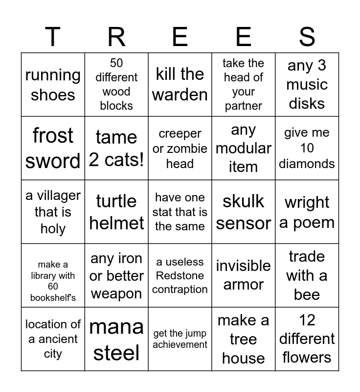 This bingo card has a free space and 24 words: any iron or better weapon, mana steel, creeper or zombie head, location of a ancient city, any 3 music disks, running shoes, frost sword, 50 different wood blocks, skulk sensor, a useless Redstone contraption, any modular item, a villager that is holy, invisible armor, trade with a bee, tame 2 cats!, make a tree house, wright a poem, kill the warden, give me 10 diamonds, turtle helmet, 12 different flowers, make a library with 60 bookshelf's, take the head of your partner and get the jump achievement.