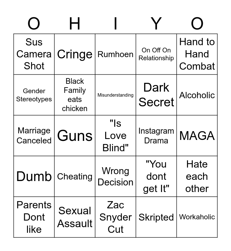 This bingo card has a free space and 24 words: Cheating, Sexual Assault, Misunderstanding, Parents Dont like, Hand to Hand Combat, Sus Camera Shot, Gender Stereotypes, Cringe, Instagram Drama, Wrong Decision, Dark Secret, Marriage Canceled, "You dont get It", Hate each other, Black Family eats chicken, Skripted, MAGA, Rumhoen, Alcoholic, Guns, Workaholic, Dumb, On Off On Relationship and Zac Snyder Cut.