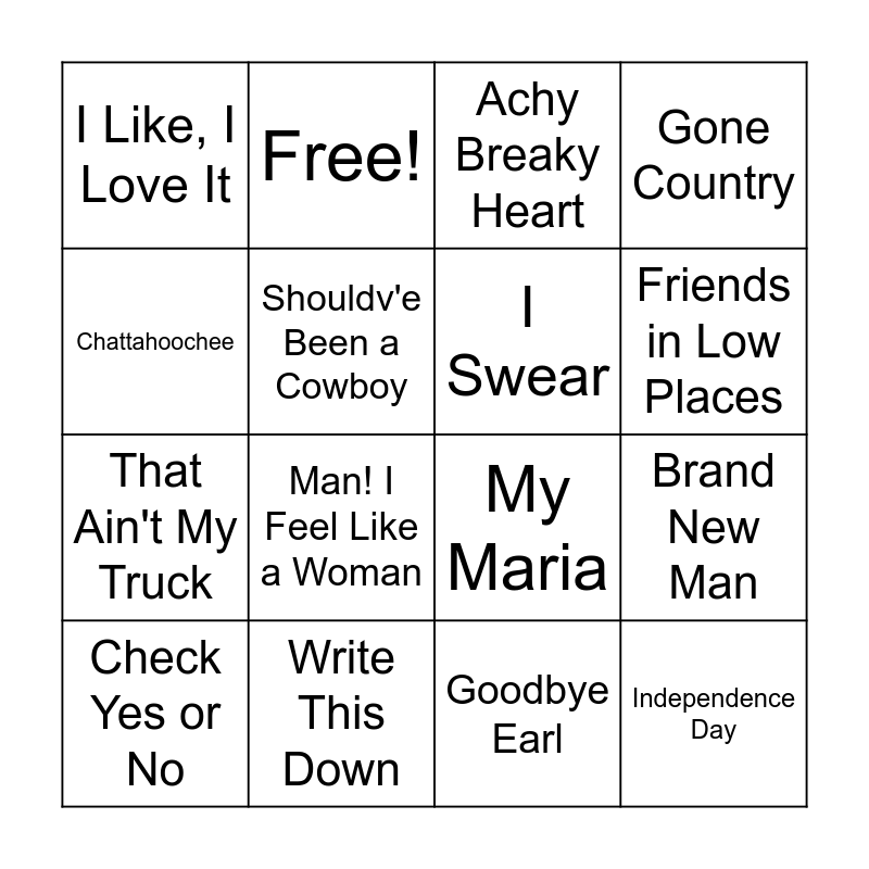 This bingo card has 33 words: Dust on the Bottle, Any Man of Mine, Brand New Man, I'm in a Hurry, Independence Day, I Swear, Chattahoochee, Cowboy Take Me Away, Free!, Time Marches On, Friends in Low Places, Achy Breaky Heart, This Kiss, The Night The Lights Went Out Georgia, Write This Down, Man! I Feel Like a Woman, Red Dirt Road, My Maria, Boot Scootin' Boogie, Callin' Baton Rouge, Watermelon Crawl, Sold, I Like, I Love It, Goodbye Earl, Heads Carolina, Tails California, Check Yes or No, Gone Country, That Ain't My Truck, Shouldv'e Been a Cowboy, Some Girls Do, She's in Love With the Boy, She Think's My Tractor's Sexy and John Deere Green.