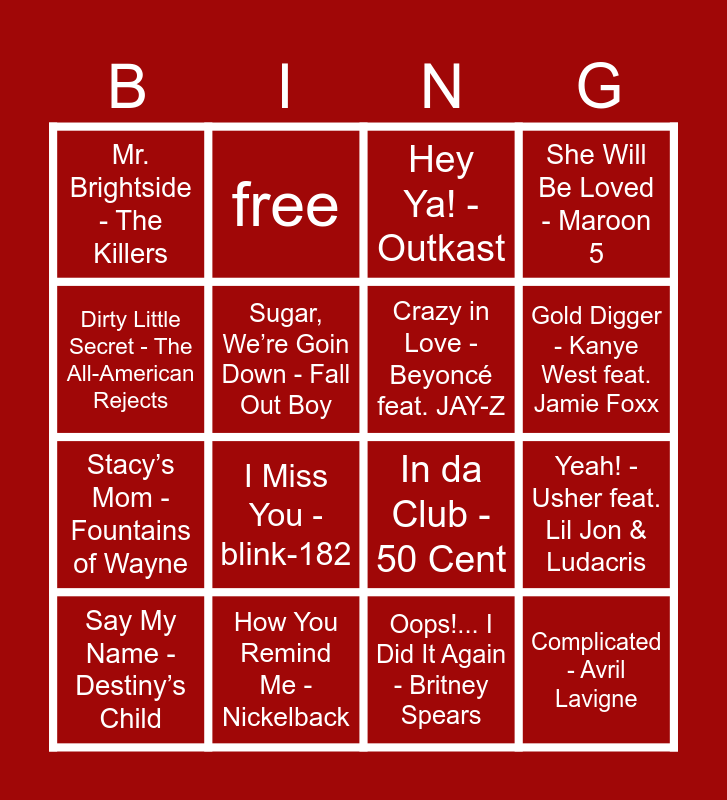 This bingo card has 34 words: A Thousand Miles - Vanessa Carlton, Beautiful - Christina Aguilera, Bring Me to Life - Evanescence, Bye Bye Bye - *NSYNC, Complicated - Avril Lavigne, Crazy in Love - Beyoncé feat. JAY-Z, Dirty Little Secret - The All-American Rejects, Drops of Jupiter (Tell Me) - Train, free, Fallin’ - Alicia Keys, Gold Digger - Kanye West feat. Jamie Foxx, Hey Ya! - Outkast, Hollaback Girl - Gwen Stefani, Hot in Herre - Nelly, How You Remind Me - Nickelback, I Miss You - blink-182, Ignition (Remix) - R. Kelly, In da Club - 50 Cent, Kryptonite - 3 Doors Down, Lady Marmalade - Christina Aguilera, Lil’ Kim, Mýa, Pink, Let Me Love You - Mario, Milkshake - Kelis, Mr. Brightside - The Killers, Oops!... I Did It Again - Britney Spears, Rock Your Body - Justin Timberlake, Say My Name - Destiny’s Child, She Will Be Loved - Maroon 5, Since U Been Gone - Kelly Clarkson, Stacy’s Mom - Fountains of Wayne, Sugar, We’re Goin Down - Fall Out Boy, Toxic - Britney Spears, Yeah! - Usher feat. Lil Jon & Ludacris, Lose Yourself- Eminem and 1,2 Step - Ciara, Missy Elliot.
