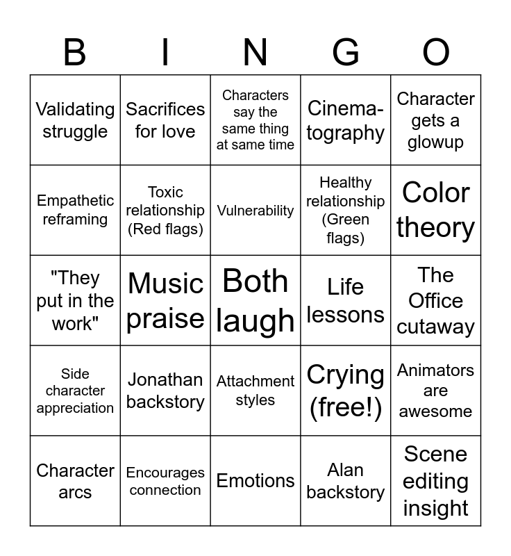 This bingo card has 25 words: Jonathan backstory, Emotions, Vulnerability, Character arcs, Character gets a glowup, Validating struggle, Empathetic reframing, Sacrifices for love, Life lessons, Attachment styles, Healthy relationship (Green flags), "They put in the work", Crying (free!), Animators are awesome, Toxic relationship (Red flags), Scene editing insight, The Office cutaway, Characters say the same thing at same time, Color theory, Music praise, Both laugh, Encourages connection, Side character appreciation, Cinema- tography and Alan backstory.