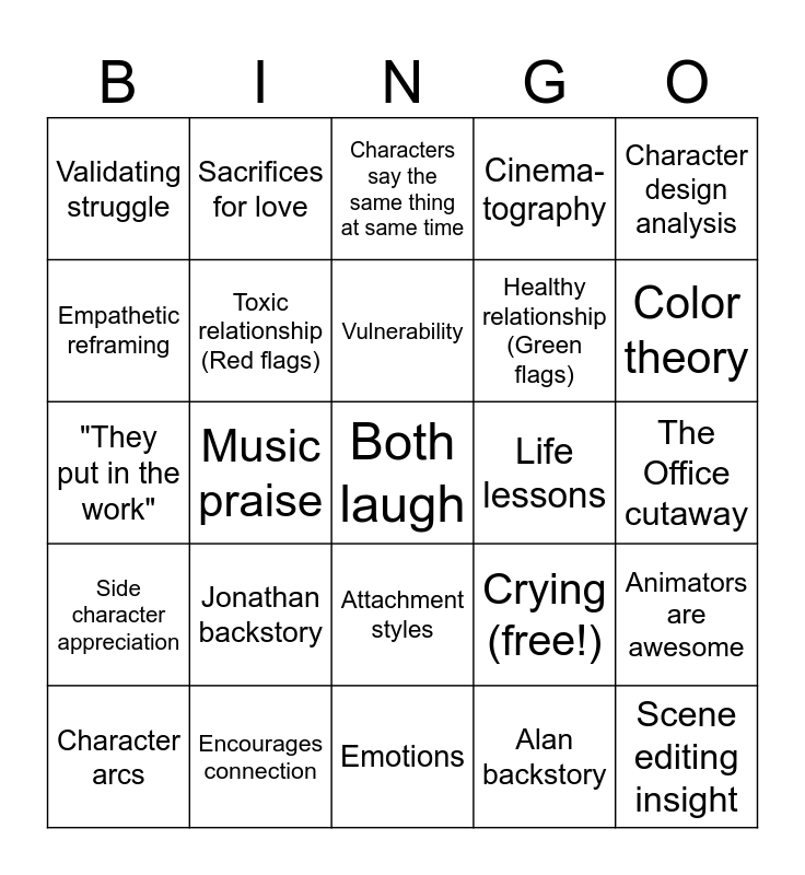 This bingo card has 25 words: Jonathan backstory, Emotions, Vulnerability, Character arcs, Character design analysis, Validating struggle, Empathetic reframing, Sacrifices for love, Life lessons, Attachment styles, Healthy relationship (Green flags), "They put in the work", Crying (free!), Animators are awesome, Toxic relationship (Red flags), Scene editing insight, The Office cutaway, Characters say the same thing at same time, Color theory, Music praise, Both laugh, Encourages connection, Side character appreciation, Cinema- tography and Alan backstory.