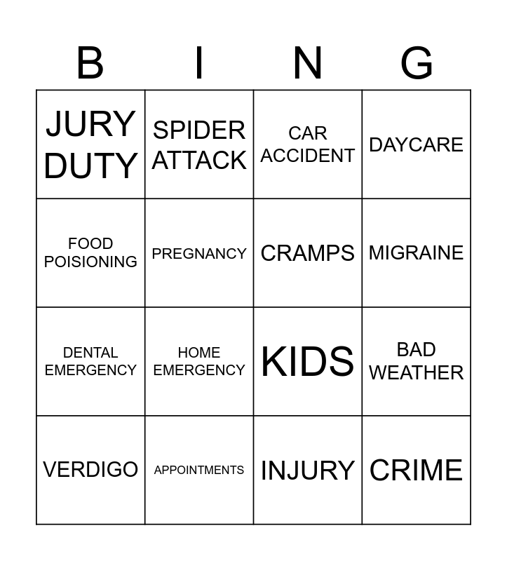 This bingo card has 16 words: APPOINTMENTS, BAD WEATHER, CAR ACCIDENT, JURY DUTY, DENTAL EMERGENCY, SPIDER ATTACK, KIDS, INJURY, FOOD POISIONING, PREGNANCY, VERDIGO, DAYCARE, HOME EMERGENCY, MIGRAINE, CRAMPS and CRIME.