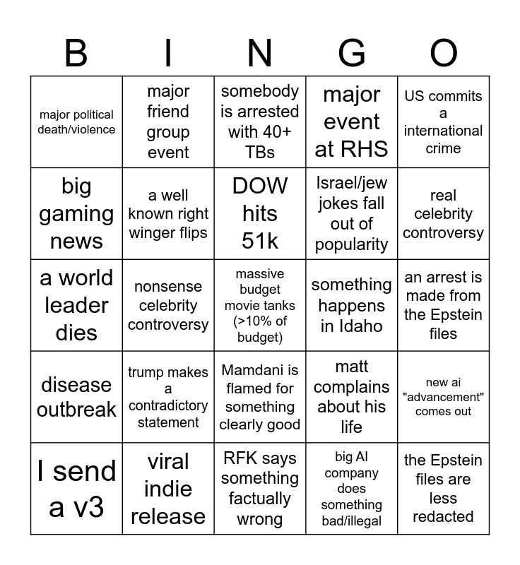 This bingo card has 25 words: trump makes a contradictory statement, RFK says something factually wrong, DOW hits 51k, I send a v3, US commits a international crime, major political death/violence, big gaming news, major friend group event, something happens in Idaho, Mamdani is flamed for something clearly good, Israel/jew jokes fall out of popularity, a world leader dies, matt complains about his life, new ai "advancement" comes out, a well known right winger flips, the Epstein files are less redacted, an arrest is made from the Epstein files, somebody is arrested with 40+ TBs, real celebrity controversy, nonsense celebrity controversy, massive budget movie tanks (>10% of budget), viral indie release, disease outbreak, major event at RHS and big AI company does something bad/illegal.