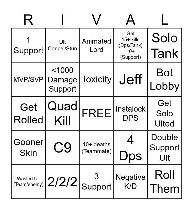 This bingo card has a free space and 24 words: C9, 2/2/2, Toxicity, Wasted Ult (Team/enemy), Solo Tank, 1 Support, MVP/SVP, Ult Cancel/Stun, Instalock DPS, 10+ deaths (Teammate), Jeff, Get Rolled, 4 Dps, Double Support Ult, <1000 Damage Support, Negative K/D, Get Solo Ulted, Animated Lord, Bot Lobby, Quad Kill, Roll Them, Gooner Skin, Get 15+ kills (Dps/Tank) 10+ (Support) and 3 Support.