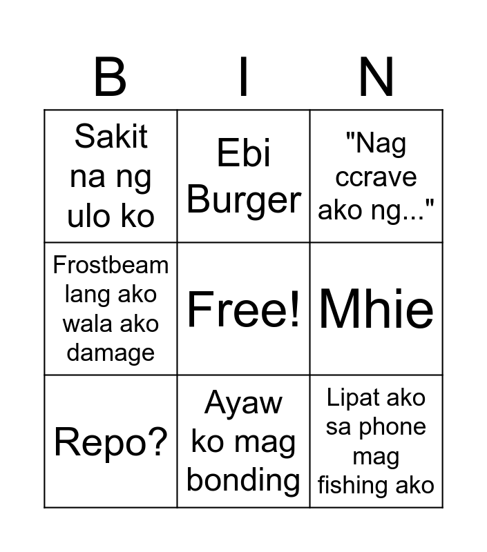 This bingo card has a free space and 8 words: Mhie, "Nag ccrave ako ng...", Ebi Burger, Repo?, Sakit na ng ulo ko, Lipat ako sa phone mag fishing ako, Frostbeam lang ako wala ako damage and Ayaw ko mag bonding.