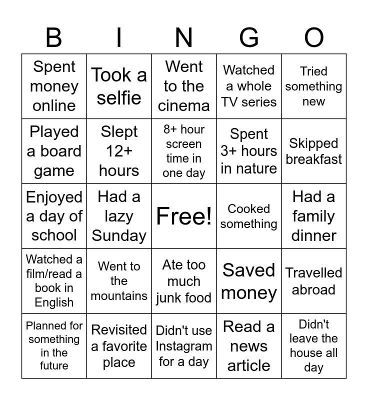 This bingo card has a free space and 28 words: Travelled abroad, Tried a new food, Spent 3+ hours in nature, Read a news article, Played a board game, Went to the cinema, Took a selfie, Watched a film/read a book in English, Cooked something, Planned for something in the future, Enjoyed a day of school, Watched a whole TV series, Revisited a favorite place, Didn't use Instagram for a day, Skipped breakfast, Exercised outside of school, Went to the mountains, Slept 12+ hours, 8+ hour screen time in one day, Ate too much junk food, Spent money online, Spoke English outside of school, Didn't leave the house all day, Had a lazy Sunday, Had a family dinner, Saved money, Tried something new and Deleted an app.