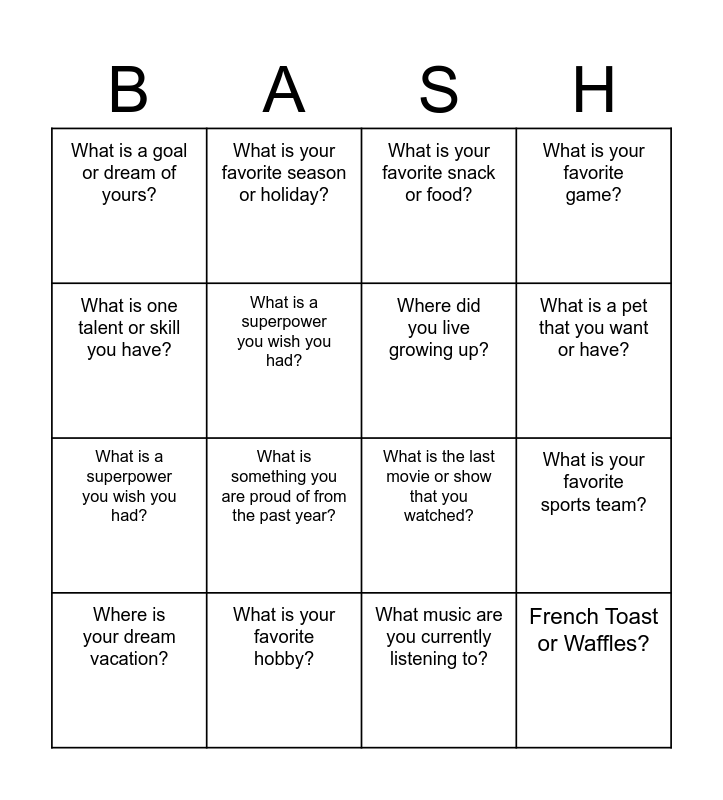 This bingo card has 16 words: What is your favorite hobby?, What is your favorite sports team?, What is your favorite snack or food?, What is a goal or dream of yours?, What is a superpower you wish you had?, What is your favorite season or holiday?, What is the last movie or show that you watched?, What music are you currently listening to?, What is one talent or skill you have?, What is a superpower you wish you had?, Where is your dream vacation?, What is your favorite game?, What is something you are proud of from the past year?, What is a pet that you want or have?, Where did you live growing up? and French Toast or Waffles?.