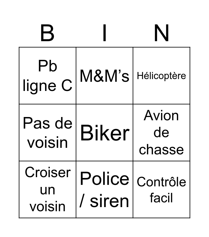 This bingo card has a free space and 8 words: Avion de chasse, Hélicoptère, M&M’s, Croiser un voisin, Pb ligne C, Contrôle facil, Pas de voisin and Police / siren.