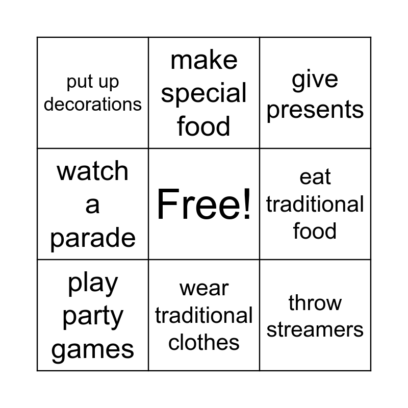 This bingo card has a free space and 8 words: eat traditional food, give presents, make special food, play party games, put up decorations, throw streamers, watch a parade and wear traditional clothes.