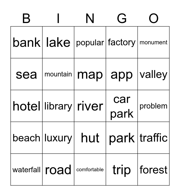 This bingo card has a free space and 24 words: luxury, road, map, waterfall, monument, bank, sea, lake, car park, hut, app, hotel, park, traffic, mountain, trip, problem, popular, valley, library, forest, beach, factory and comfortable.