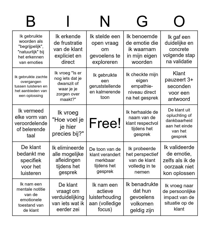 This bingo card has a free space and 50 words: Ik checkte mijn eigen emotionele reactie tijdens het gesprek, Ik vroeg naar de persoonlijke impact van de situatie op de klant, Ik onderscheidde duidelijk feiten van gevoelens in het verhaal van de klant, Ik nam een actieve luisterhouding aan (volledige focus), Ik elimineerde alle mogelijke afleidingen tijdens het gesprek, Ik zette een bewuste intentie om te luisteren naar de emoties, Ik erkende de frustratie van de klant expliciet en direct, Ik gaf de klant voldoende ruimte om te ventileren, Ik gebruikte zachte overgangen tussen luisteren en het aanbieden van een oplossing, Ik vermeed de algemene uitspraak "Ik begrijp het" zonder verdere context, Ik vroeg "Is er nog iets dat je dwarszit of waar je je zorgen over maakt?", Ik benoemde de emotie die ik waarnam in mijn eigen woorden, Ik valideerde de emotie, zelfs als ik de oorzaak niet kon oplossen, Ik probeerde het perspectief van de klant volledig in te nemen, Ik liet mijn eigen vooroordelen of aannames los, Ik ademde diep in om een stressvolle reactie te kalmeren, Ik gebruikte een geruststellende en kalmerende toon, Ik herhaalde de naam van de klant respectvol tijdens het gesprek, Ik toonde betrokkenheid bij de zoektocht naar een passende oplossing, Ik gaf een duidelijke en concrete volgende stap na validatie, Ik vroeg "Hoe voel je je hier precies bij?", Ik benadrukte dat hun gevoelens volkomen geldig zijn, Ik gebruikte woorden als "begrijpelijk", "natuurlijk" bij het erkennen van emoties, Ik checkte mijn eigen empathie-niveau direct na het gesprek, Ik maakte een duidelijke verbinding tussen de emotie en de impact van het probleem, Ik gaf een oprechte verontschuldiging voor het ongemak of de situatie, Klant pauzeert 3+ seconden voor een antwoord, Klant gebruikt een expliciet emotioneel woord (bv. 'gefrustreerd', 'opgelucht'), Ik stelde een open vraag om gevoelens te exploreren, De toon van de klant verandert merkbaar tijdens het gesprek, Ik vatte zowel de feiten als de gevoelens van de klant samen, Klant zucht hoorbaar of maakt een uitroep van ongenoegen, Ik gebruikte de "echo"-techniek door een emotie te herhalen, Ik liet de klant volledig uitpraten zonder te onderbreken, De klant vraagt om verduidelijking van iets wat ik eerder zei, Ik vermeed elke onderbreking gedurende minstens 1 volle minuut, De stem van de klant klinkt gespannen of emotioneel geladen, Ik bevestigde een waargenomen emotie (bv. "Ik hoor je frustratie"), Ik identificeerde een onuitgesproken, onderliggende emotie, De klant uit opluchting of dankbaarheid aan het einde van het gesprek, Ik gebruikte empathische taal (bv. "Ik kan me voorstellen hoe dat voelt..."), Ik reflecteerde een gevoel met een passende uitspraak (bv. "Dat klinkt frustrerend"), Klant herhaalt een sleutelzin of een belangrijk probleem, Ik behield een kalme, stabiele en geruststellende toon, Ik nam een mentale notitie van de emotionele toestand van de klant, Ik vermeed elke vorm van veroordelende of belerende taal, Ik bevestigde mijn begrip van de specifieke situatie van de klant, Ik bood een oplossing aan die ook hun gevoelens erkende, De klant bedankt me specifiek voor het luisteren and Ik toonde geduld, zelfs bij herhaling van reeds gegeven informatie.