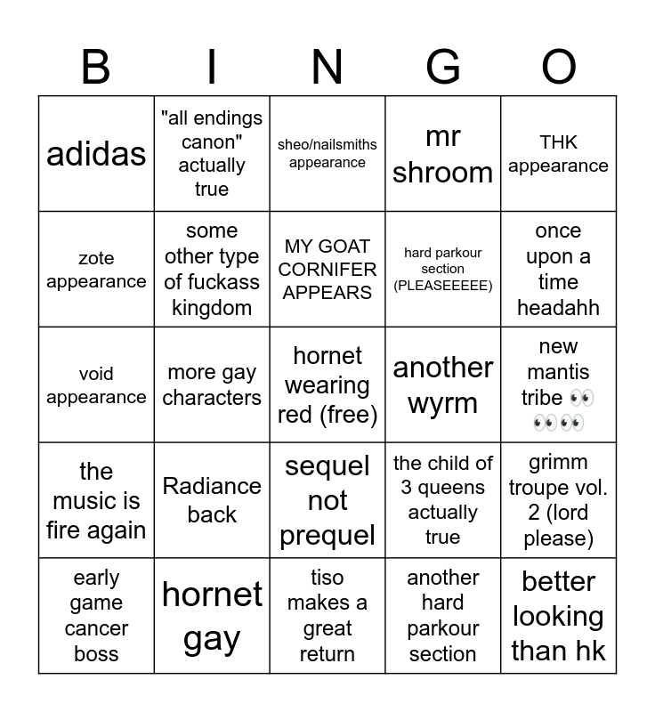 This bingo card has a free space and 24 words: Radiance back, hornet gay, MY GOAT CORNIFER APPEARS, early game cancer boss, THK appearance, adidas, zote appearance, "all endings canon" actually true, another wyrm, sequel not prequel, hard parkour section (PLEASEEEEE), void appearance, the child of 3 queens actually true, grimm troupe vol. 2 (lord please), some other type of fuckass kingdom, another hard parkour section, new mantis tribe 👀👀👀, sheo/nailsmiths appearance, once upon a time headahh, more gay characters, better looking than hk, the music is fire again, mr shroom and tiso makes a great return.