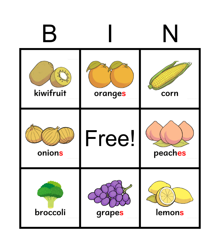 Plural Fruits and Vegetables | Los Colores | Noun and Verb Endings | Berry Bingo | Parsing Bingo