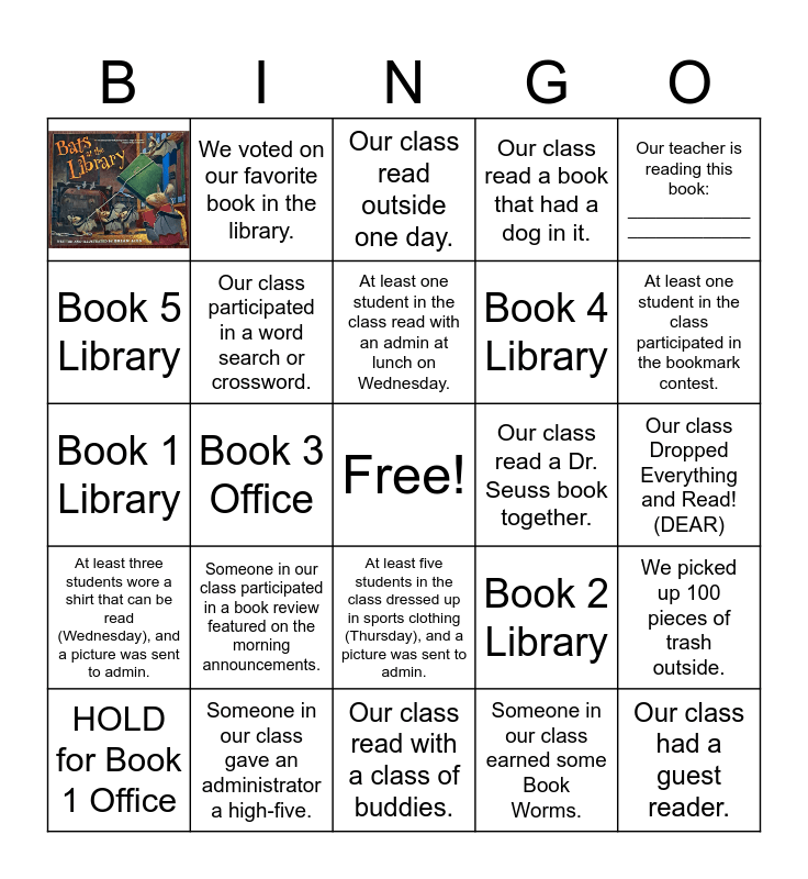 This bingo card has 1 images, a free space and 28 words: HOLD for Book 1 Office, HOLD for Book 2 Office, Book 3 Office, Book 4 Office, Our class read outside one day., Our class participated in a word search or crossword., Someone in our class participated in a book review featured on the morning announcements., Our class read a Dr. Seuss book together., Someone in our class gave an administrator a high-five., Our class Dropped Everything and Read! (DEAR), Our class had a guest reader., Our class read with a class of buddies., Someone in our class earned some Book Worms., At least one student in the class participated in the bookmark contest., At least one student in the class dressed up for "Book Character Day" (Tuesday), and a picture was sent to admin., At least five students in the class dressed up in sports clothing (Thursday), and a picture was sent to admin., At least three students wore a shirt that can be read (Wednesday), and a picture was sent to admin., Our teacher is reading this book: _____________ _____________, Book 1 Library, Book 2 Library, Book 3 Library, Book 4 Library, Book 5 Library, Our class read a book that had a dog in it., We voted on our favorite book in the library., We picked up 100 pieces of trash outside., At least one student in the class read with an admin at lunch on Wednesday. and We went to Friday Morning Announcements, and someone in the class gave Cal a hug..