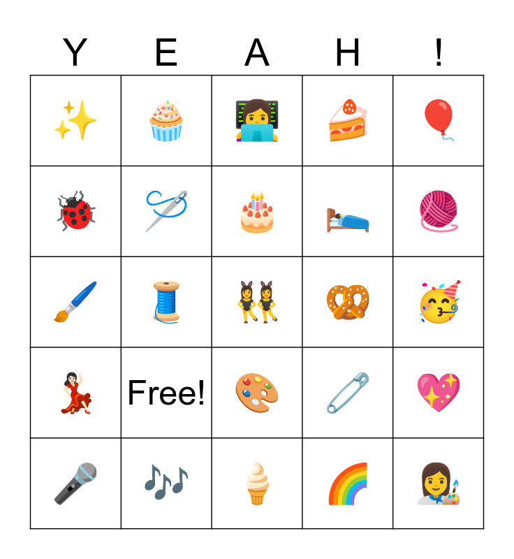This bingo card has 25 words: Free!, ๐ฆ, ๐, ๐ค, ๐, โจ, ๐, ๐ง, ๐ฅจ, ๐จ, ๐, ๐๏ธ, ๐งท, ๐, ๐ชก, ๐ฉโ๐จ, ๐ฅณ, ๐ฉโ๐ป, ๐งถ, ๐งต, ๐ฏโโ๏ธ, ๐ถ, ๐๐ป, ๐ฐ and ๐.