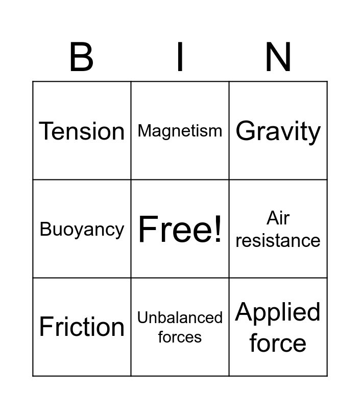 This bingo card has a free space and 9 words: Friction, Gravity, Magnetism, Buoyancy, Tension, Air resistance, Applied force, Balanced forces and Unbalanced forces.