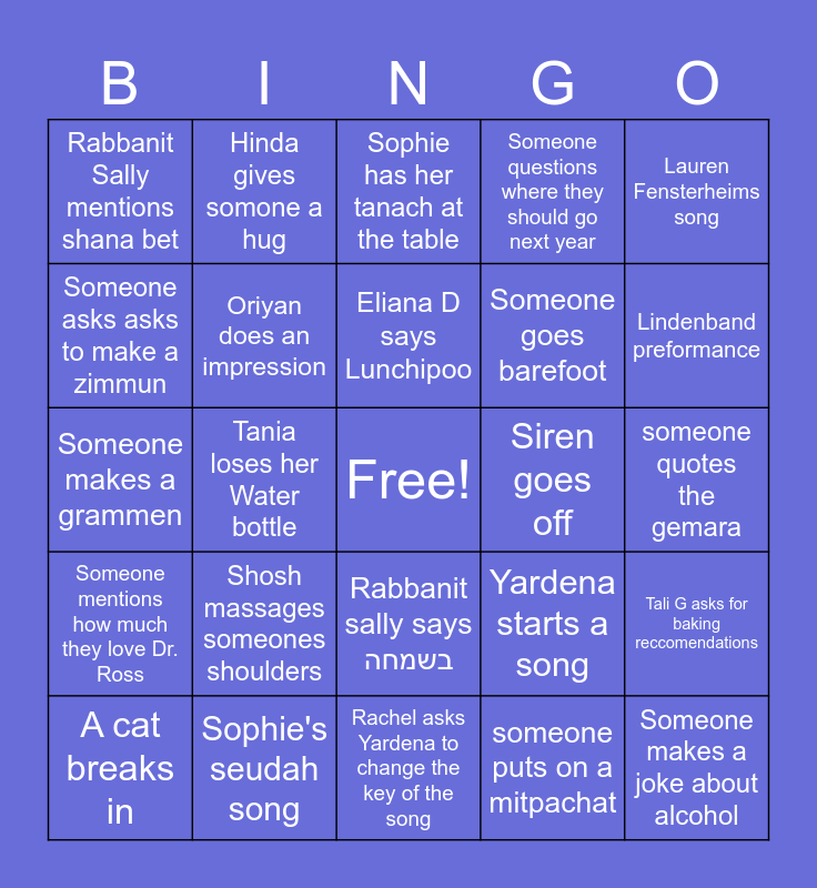 This bingo card has a free space and 24 words: Shosh massages someones shoulders, Sophie's seudah song, Eliana D says Lunchipoo, A cat breaks in, Lauren Fensterheims song, Rabbanit Sally mentions shana bet, Someone asks asks to make a zimmun, Hinda gives somone a hug, Siren goes off, Rabbanit sally says בשמחה, Someone goes barefoot, Someone makes a grammen, Yardena starts a song, Tali G asks for baking reccomendations, Oriyan does an impression, someone puts on a mitpachat, someone quotes the gemara, Sophie has her tanach at the table, Lindenband preformance, Tania loses her Water bottle, Someone makes a joke about alcohol, Someone mentions how much they love Dr. Ross, Someone questions where they should go next year and Rachel asks Yardena to change the key of the song.