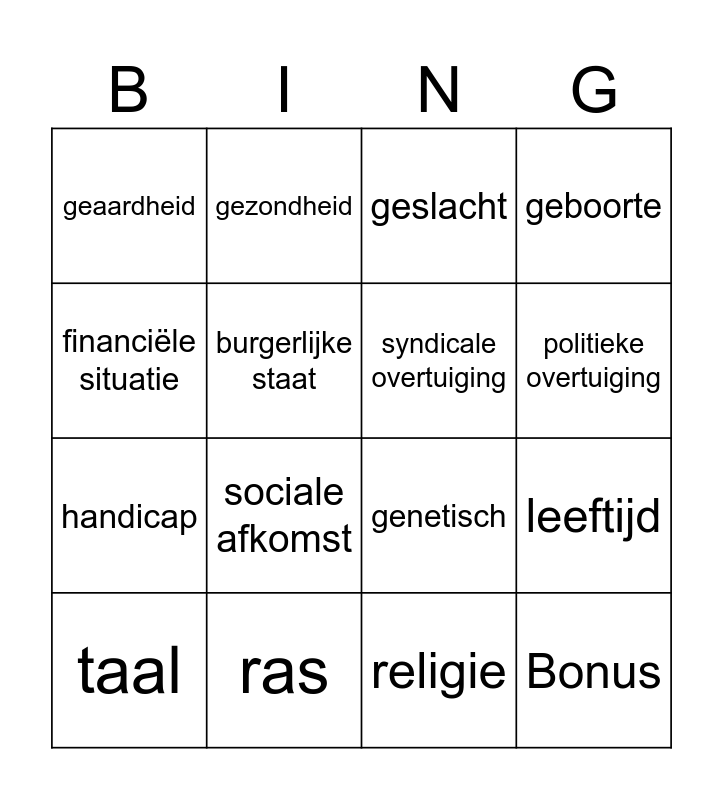 This bingo card has 16 words: ras, leeftijd, geslacht, geaardheid, handicap, gezondheid, genetisch, religie, financiële situatie, burgerlijke staat, taal, geboorte, sociale afkomst, politieke overtuiging, syndicale overtuiging and Bonus.