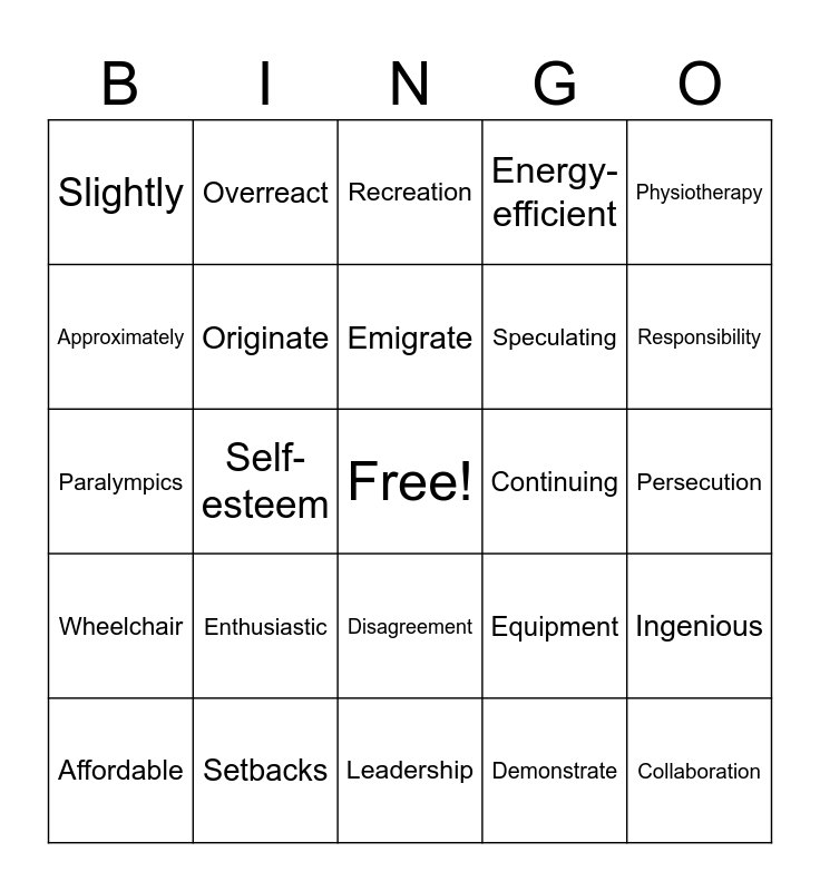 This bingo card has a free space and 30 words: Setbacks, Unavoidable, Self-esteem, Physical, Slightly, Recreation, Originate, Disagreement, Continuing, Leadership, Persecution, Collaboration, Demonstrate, Consequences, Responsibility, Organizational, Equipment, Wheelchair, Enthusiastic, Physiotherapy, Paralympics, Emotional, Overreact, Speculating, Approximately, Energy-efficient, Ingenious, Affordable, Emigrate and Communal.