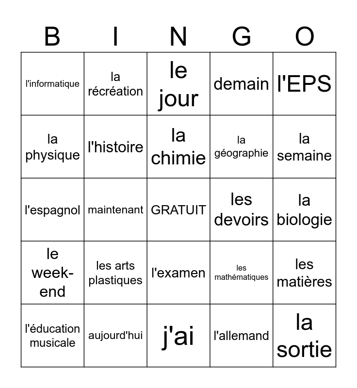 This bingo card has a free space and 24 words: les arts plastiques, aujourd'hui, la chimie, l'éducation musicale, l'EPS, l'informatique, la physique, la récréation, les devoirs, l'examen, la géographie, l'espagnol, les mathématiques, les matières, l'histoire, l'allemand, la biologie, le jour, la semaine, maintenant, la sortie, le week-end, demain and j'ai.