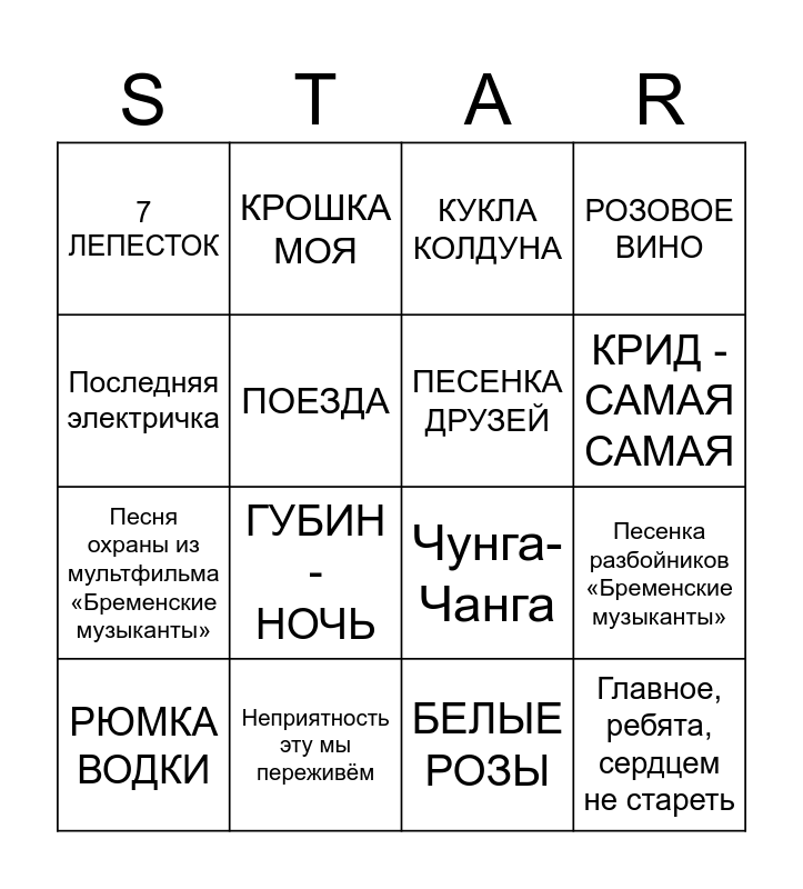 This bingo card has 16 words: Неприятность эту мы переживём, Песенка разбойников «Бременские музыканты», КУКЛА КОЛДУНА, 7 ЛЕПЕСТОК, Песня охраны из мультфильма «Бременские музыканты», КРОШКА МОЯ, Чунга-Чанга, БЕЛЫЕ РОЗЫ, Последняя электричка, ПОЕЗДА, РЮМКА ВОДКИ, РОЗОВОЕ ВИНО, ГУБИН - НОЧЬ, КРИД - САМАЯ САМАЯ, ПЕСЕНКА ДРУЗЕЙ and Главное, ребята, сердцем не стареть.