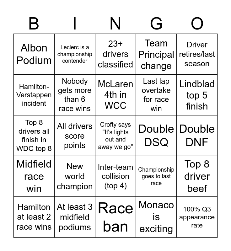 This bingo card has a free space and 24 words: New world champion, At least 3 midfield podiums, McLaren 4th in WCC, Hamilton at least 2 race wins, Driver retires/last season, Albon Podium, Hamilton-Verstappen incident, Leclerc is a championship contender, Double DSQ, Inter-team collision (top 4), Last lap overtake for race win, Top 8 drivers all finish in WDC top 8, Championship goes to last race, Top 8 driver beef, Nobody gets more than 6 race wins, Monaco is exciting, Double DNF, 23+ drivers classified, Lindblad top 5 finish, All drivers score points, 100% Q3 appearance rate, Midfield race win, Team Principal change and Race ban.