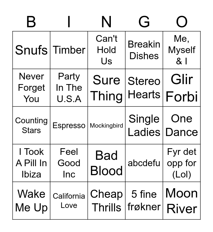 This bingo card has a free space and 39 words: Lean on, Dra Tilbake, Lush Life, Party In The U.S.A, Wake Me Up, Bad Blood, Sure Thing, Cake By The Ocean, Me, Myself & I, I Took A Pill In Ibiza, Espresso, Breakin Dishes, Moon River, One Dance, Single Ladies, Feel Good Inc, Homecoming, Snufs, Save Your Tears, abcdefu, Never Forget You, Cheap Thrills, Stereo Hearts, Glir Forbi, Thrift Shop, Animals, I Gotta Feeling, Time of Our Lives, Just Dance, Timber, Kallenavn, Glade Dager, Can't Hold Us, California Love, 5 fine frøkner, SexyBack, Fyr det opp for (Lol), Counting Stars and Ms. Jackson.