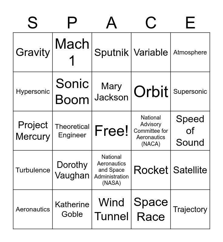 This bingo card has a free space and 24 words: Dorothy Vaughan, Katherine Goble, Mary Jackson, Aeronautics, Atmosphere, Gravity, Hypersonic, Mach 1, National Advisory Committee for Aeronautics (NACA), National Aeronautics and Space Administration (NASA), Orbit, Project Mercury, Rocket, Satellite, Sonic Boom, Space Race, Speed of Sound, Sputnik, Supersonic, Theoretical Engineer, Trajectory, Turbulence, Variable and Wind Tunnel.