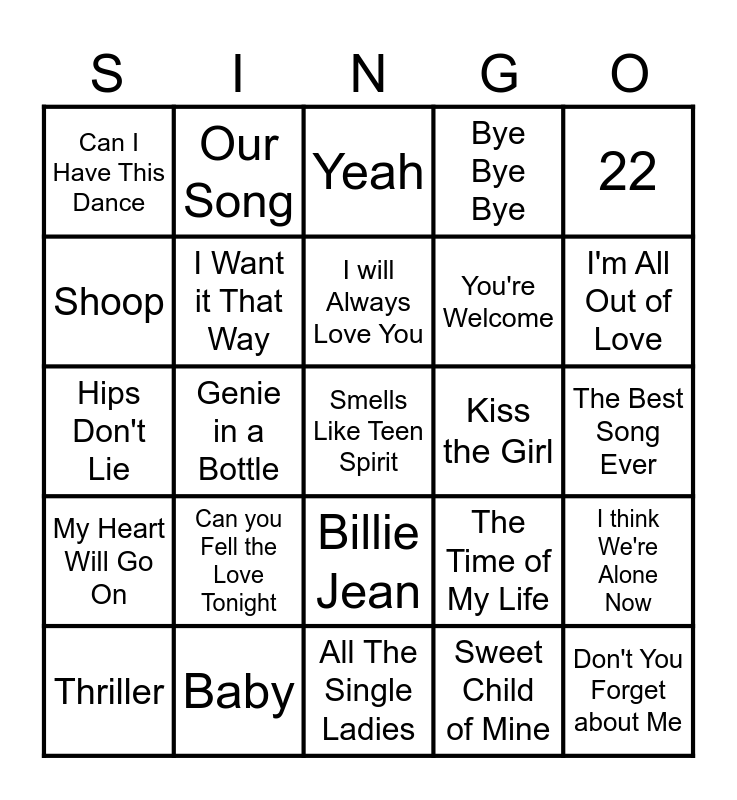 This bingo card has 37 words: I Wanna Dance with Somebody, That's the Way It IS, Crazy, I Want it That Way, I think We're Alone Now, Can you Fell the Love Tonight, I will Always Love You, Unwritten, 22, Livin on a Prayer, Genie in a Bottle, Bye Bye Bye, Smells Like Teen Spirit, The Best Song Ever, Shoop, My Heart Will Go On, I'll Make a Man Out of You, Yeah, Billie Jean, Kiss the Girl, Can I Have This Dance, I'm All Out of Love, Thriller, All The Single Ladies, Heads Carolina, Tails California, Sweet Child of Mine, Our Song, Power of Love, Total Eclipse of the Heart, I Dreamed a Dream, What a feeling, Baby, Hips Don't Lie, Don't You Forget about Me, The Time of My Life, You're Welcome and Like a Prayer.