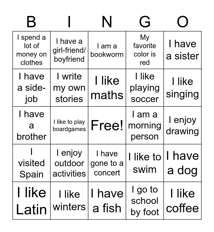 This bingo card has a free space and 28 words: I have a dog, I play the piano, I like playing soccer, I go to school by foot, I have a side-job, I am a bookworm, I have a girl-friend/ boyfriend, I visited Spain, I am a morning person, I like Latin, I have a brother, My favorite color is red, I like winters, I have a fish, I like singing, My favorite dinner is pizza, I enjoy outdoor activities, I write my own stories, I like maths, I have gone to a concert, I spend a lot of money on clothes, I play the guitar, I like coffee, I like to play boardgames, I enjoy drawing, I like to swim, I have a sister and I enjoy cooking or baking.