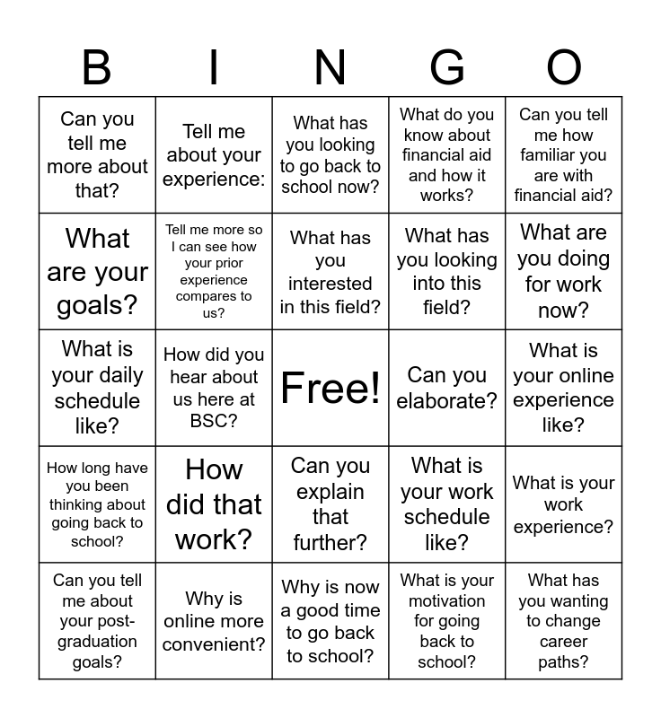 This bingo card has a free space and 24 words: How did that work?, Why is online more convenient?, What has you interested in this field?, Can you tell me about your post-graduation goals?, Can you tell me how familiar you are with financial aid?, Can you tell me more about that?, What are your goals?, Tell me about your experience:, Can you elaborate?, Can you explain that further?, What has you looking into this field?, What is your daily schedule like?, What is your work schedule like?, What is your work experience?, Tell me more so I can see how your prior experience compares to us?, What is your motivation for going back to school?, What is your online experience like?, What has you looking to go back to school now?, What are you doing for work now?, How did you hear about us here at BSC?, What has you wanting to change career paths?, How long have you been thinking about going back to school?, What do you know about financial aid and how it works? and Why is now a good time to go back to school?.