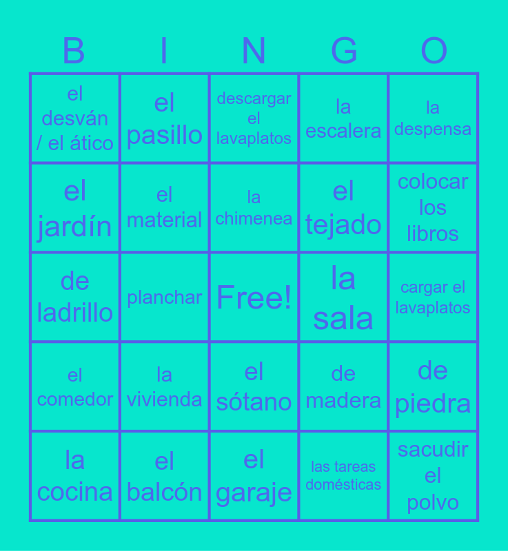 This bingo card has a free space and 24 words: la vivienda, el balcón, la chimenea, la cocina, la despensa, el desván / el ático, el jardín, el pasillo, la sala, el sótano, el tejado, de ladrillo, de madera, de piedra, el material, las tareas domésticas, cargar el lavaplatos, descargar el lavaplatos, colocar los libros, planchar, sacudir el polvo, el comedor, la escalera and el garaje.