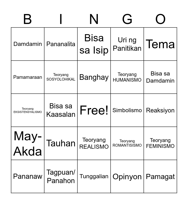 This bingo card has a free space and 24 words: Tauhan, Tagpuan/ Panahon, Banghay, Pananaw, Tema, Damdamin, Pamamaraan, Pananalita, Simbolismo, Teoryang REALISMO, Teoryang HUMANISMO, Teoryang EKSISTENSYALISMO, Teoryang ROMANTISISMO, Teoryang FEMINISMO, Teoryang SOSYOLOHIKAL, Opinyon, Reaksiyon, Bisa sa Isip, Bisa sa Damdamin, Bisa sa Kaasalan, Pamagat, May-Akda, Uri ng Panitikan and Tunggalian.