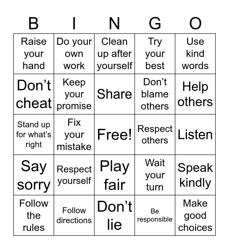 This bingo card has a free space and 39 words: Tell the truth, Be honest, Do the right thing, Keep your promise, Follow the rules, Play fair, Share, Take turns, Use kind words, Say sorry, Fix your mistake, Try your best, Make good choices, Listen, Respect others, Respect yourself, Respect property, Raise your hand, Be a good sport, Wait your turn, Don’t cheat, Don’t lie, Don’t blame others, Help others, Keep your hands to yourself, Stay calm, Think before you act, Admit when you’re wrong, Return something you found, Do your own work, Be a good friend, Keep your word, Clean up after yourself, Follow directions, Be responsible, Keep promises, Speak kindly, Stand up for what’s right and Tell an adult the truth.