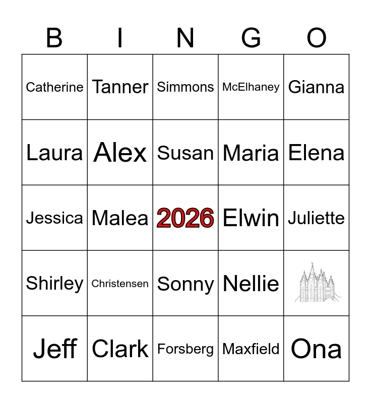 This bingo card has 4 images, a free space and 70 words: Kastanis, Nasson, Simmons, Pickett, Reeves, Sabre, Greg, Perry, Jeff, Ande, Rachel, Trish, Susan, Laura, Ghis, Malea, Kaeli, Elena, Nick, Jessica, Alex, Tanner, McElhaney, Lewis, Ona, Fielding, Andromahi, Isidoris, Ladon, Alaina, Gianna, Jonah, Austin, Dallin, Charlotte, Maxfield, Dean, Ann, Barlow, Blotter, Forsberg, Clark, Carter, Emmy, Anne, Catherine, Gunner, Christensen, Daniel, Caroline, Cami, Gabrielle, Juliette, Logan, Sonny, Nicholas, Maria, Velda, Shirley, John, Elwin, Garth, Cathy, Harold, Nellie, Evelyne, West Jordan, Tremonton, Bingham Canyon and Michel.