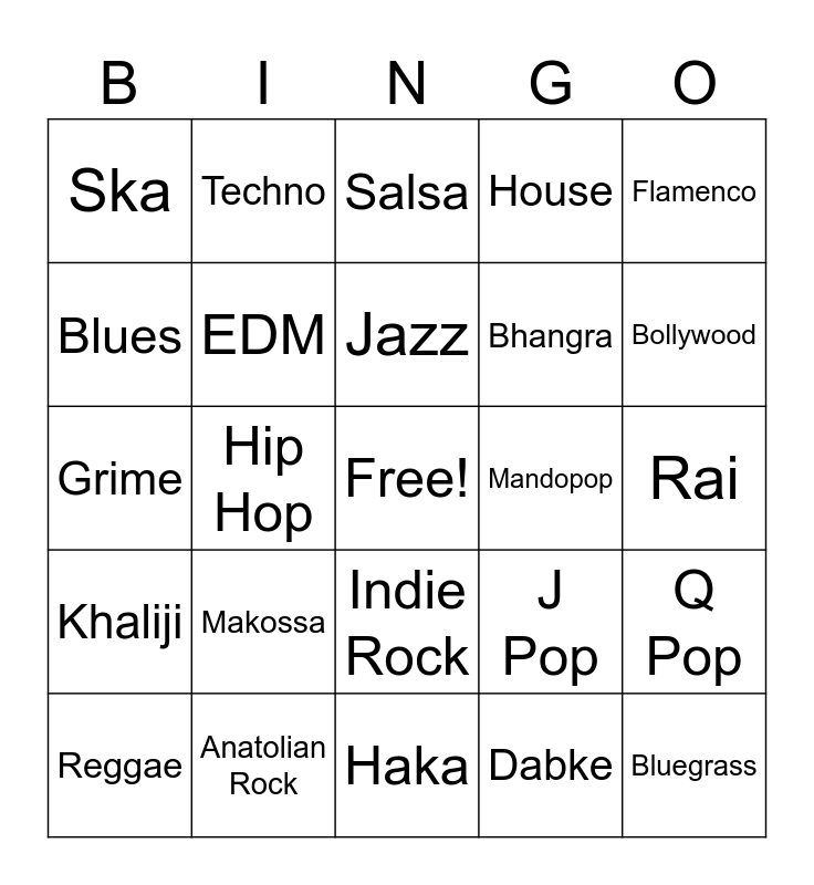This bingo card has a free space and 77 words: Fado, Gnawa, Salsa, Bachata, Reggaeton, Cumbia, Tango, Merengue, Samba, Bossa Nova, Mariachi, Dembow, Jazz, Blues, Country, Hip Hop, R&B, Bluegrass, Gospel, Flamenco, Disco, Grime, EDM, Techno, House, Folk, Opera, Highlife, Amapiano, Afrobeat, Gqom, Soukous, K Pop, J Pop, Bollywood, Bhangra, Trot, Enka, Rai, Dabke, Arabic Pop, Vallenato, Son Cubano, Chicha, Zouk, Calypso, Reggae, Ska, Funk, Soul, Trap, Indie Rock, Punk, Alternative Rock, Italo Disco, Drum and Bass, Synthpop, Schlager, Chanson, Polka, Makossa, Kizomba, Fuji, Juju, Taarab, Afro House, City Pop, Mandopop, Cantopop, Pansori, Luk Thung, Q Pop, Khaliji, Anatolian Rock, Mizrahi, Haka and Kaneka.
