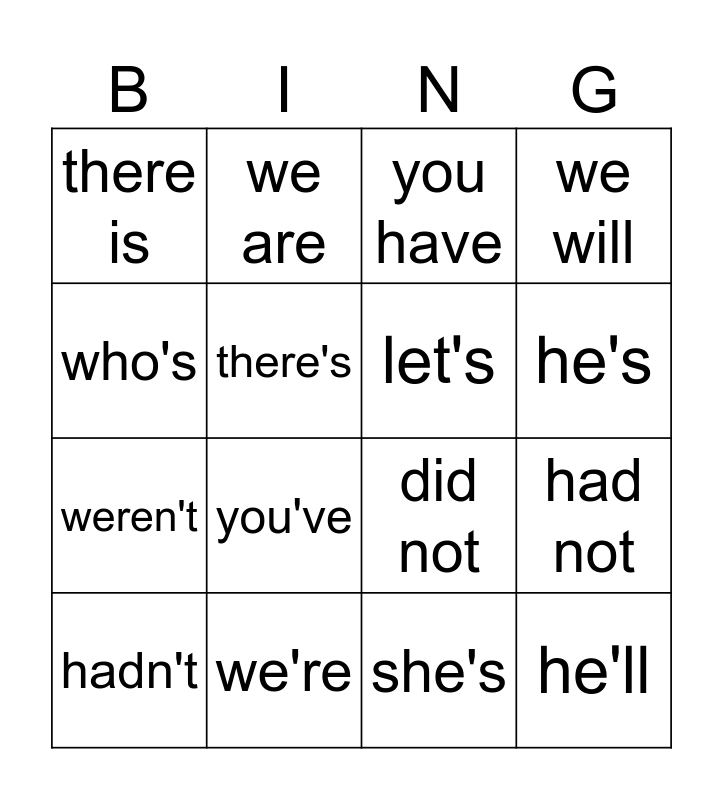 This bingo card has 25 words: Free!, he has, he's, who is, who's, there is, there's, we are, we're, were not, weren't, did not, didn't, let us, let's, she is, she's, you have, you've, had not, hadn't, he will, he'll, we will and we'll.