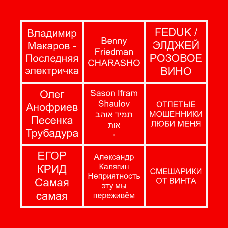 This bingo card has 30 words: Песенка разбойников «Бременские музыканты», Песня охраны «Бременские музыканты», Ласковый май - Белые розы, ГРИГОРИЙ ЛЕПС Рюмка, Владимир Макаров - Последняя электричка, FEDUK / ЭЛДЖЕЙ РОЗОВОЕ ВИНО, ЕГОР КРИД Самая самая, Геннадий Гладков ПЕСЕНКА ДРУЗЕЙ, АНДРЕЙ ГУБИН Ночь, Лев Барашков Главное, ребята, сердцем не стареть, Чунга-Чанга, РУКИ ВВЕРХ Крошка моя, Муслим Магомаев Лучший город земли, BIG BABY TAPE Supersonic, Муслим Магомаев Песенка трубадура, ЖЕНЯ ТРОФИМОВ Поезда, Олег Анофриев ЕСТЬ ТОЛЬКО МИГ, ГИМН ЯХАД, Yaakov Shwekey Am Israel, Sason Ifram Shaulov תמיד אוהב אות י, Олег Анофриев Наступила ночь, Gad Elbaz Hashem Melech, Benny Friedman CHARASHO, СМЕШАРИКИ ОТ ВИНТА, ОТПЕТЫЕ МОШЕННИКИ ЛЮБИ МЕНЯ, Олег Анофриев Песенка Трубадура, АНТОН ТОКАРЕВ Седьмой лепесток, Владимир Ферапонтов Песенка крокодила Гены, Александр Калягин Неприятность эту мы переживём and КОРОЛЬ и ШУТ Кукла колдуна.