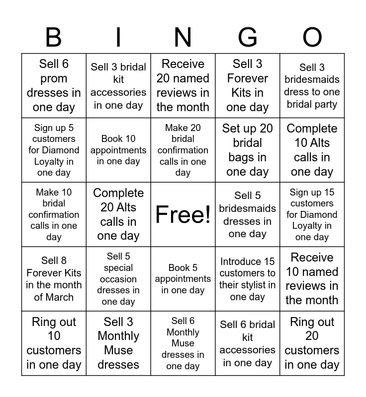 This bingo card has a free space and 24 words: Sell 5 special occasion dresses in one day, Sell 3 Monthly Muse dresses, Make 20 bridal confirmation calls in one day, Ring out 10 customers in one day, Sell 3 bridesmaids dress to one bridal party, Sell 6 prom dresses in one day, Sign up 5 customers for Diamond Loyalty in one day, Sell 3 bridal kit accessories in one day, Sell 5 bridesmaids dresses in one day, Book 5 appointments in one day, Set up 20 bridal bags in one day, Make 10 bridal confirmation calls in one day, Introduce 15 customers to their stylist in one day, Receive 10 named reviews in the month, Book 10 appointments in one day, Sell 6 bridal kit accessories in one day, Sign up 15 customers for Diamond Loyalty in one day, Receive 20 named reviews in the month, Complete 10 Alts calls in one day, Complete 20 Alts calls in one day, Ring out 20 customers in one day, Sell 8 Forever Kits in the month of March, Sell 3 Forever Kits in one day and Sell 6 Monthly Muse dresses in one day.