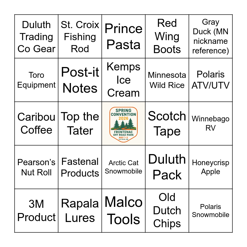 This bingo card has a free space and 30 words: 3M Product, Spam, Polaris ATV/UTV, Arctic Cat, Red Wing Boots, Duluth Trading Co Gear, Prince Pasta, Honeycrisp Apple, Top the Tater, Old Dutch Chips, Pearson’s Nut Roll, Kemps Ice Cream, Nordic Ware, Rapala Lures, Duluth Pack, Marvin Windows, Malco Tools, Winnebago RV, Fastenal Products, Minnesota Wild Rice, Caribou Coffee, Faribault Woolen Mill Blanket, Gray Duck (MN nickname reference), Post-it Notes, Scotch Tape, Toro Equipment, Arctic Cat Snowmobile, Polaris Snowmobile, St. Croix Fishing Rod and Lund Boats.