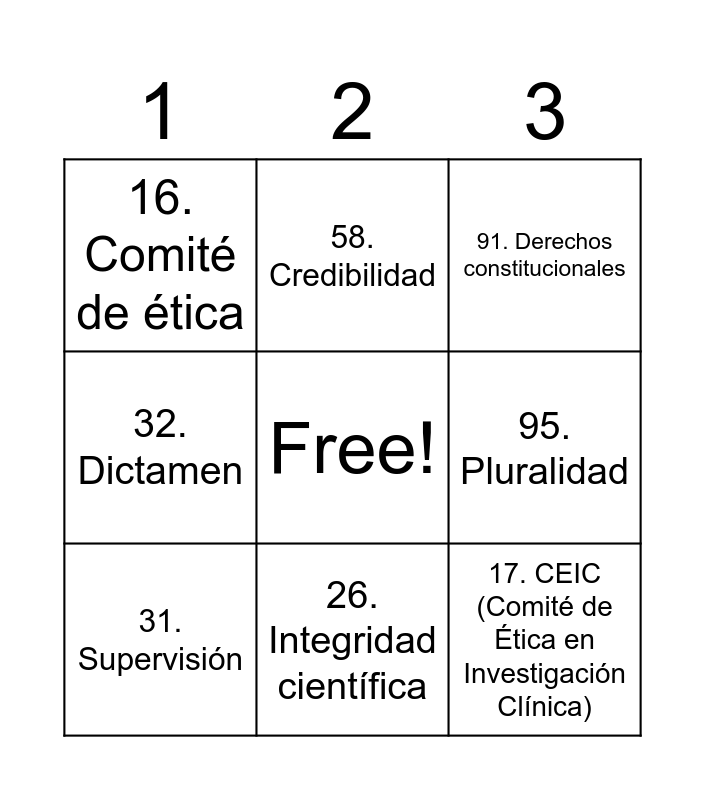 This bingo card has a free space and 97 words: 1. Ética, 2. Bioética, 3. Investigación, 4. Investigación clínica, 5. Dignidad, 6. Derechos humanos, 7. Bienestar, 8. Autonomía, 9. Beneficencia, 10. No maleficencia, 11. Justicia, 12. Confidencialidad, 13. Consentimiento informado, 14. Participantes, 15. Protocolo, 16. Comité de ética, 17. CEIC (Comité de Ética en Investigación Clínica), 18. Evaluación ética, 19. Riesgo, 20. Beneficio, 21. Riesgo-beneficio, 22. Vulnerabilidad, 23. Protección, 24. Regulación, 25. Transparencia, 26. Integridad científica, 27. Conflicto de interés, 28. Sesgo, 29. Plagio, 30. Ciberplagio, 31. Supervisión, 32. Dictamen, 33. Aprobación, 34. Ensayo clínico, 35. Placebo, 36. Acceso post-ensayo, 37. Datos personales, 38. Anonimato, 39. Código de Núremberg, 40. Declaración de Helsinki, 41. Informe Belmont, 42. Ley General de Salud, 43. Reglamento sanitario, 44. Buenas prácticas clínicas, 45. CIOMS (Consejo de Organizaciones Internacionales de las Ciencias Médicas), 46. Marco legal, 47. Principios éticos, 48. Selección equitativa, 49. Riesgo mínimo, 50. Riesgo mayor, 51. Fundamento científico, 52. Evaluación independiente, 53. Revisión científica, 54. Responsabilidad sanitaria, 55. Derechos del paciente, 56. Protección de datos, 57. Monitoreo, 58. Credibilidad, 59. Validez científica, 60. Publicaciones médicas, 61. Integridad académica, 62. Sanciones, 63. Confianza social, 64. Investigación médica, 65. Estudios en humanos, 66. Asentimiento, 67. Capacidad legal, 68. Libertad de decisión, 69. Voluntariedad, 70. No coerción, 71. Suspensión del estudio, 72. Evidencia científica, 73. Declaración pública, 74. Patrocinio, 75. Intereses financieros, 76. Objetividad, 77. Ética profesional, 78. Protección jurídica, 79. Normativa internacional, 80. Regulación nacional, 81. Comité independiente, 82. Seguridad, 83. Salud pública, 84. Distribución justa, 85. Maximización de beneficios, 86. Minimización de riesgos, 87. Cultura ética, 88. Formación ética, 89. Honestidad, 90. Responsabilidad, 91. Derechos constitucionales, 92. Supervisión externa, 93. Evaluación sistemática, 94. Acreditación, 95. Pluralidad, 96. Autonomía institucional and 97. Investigación responsable.