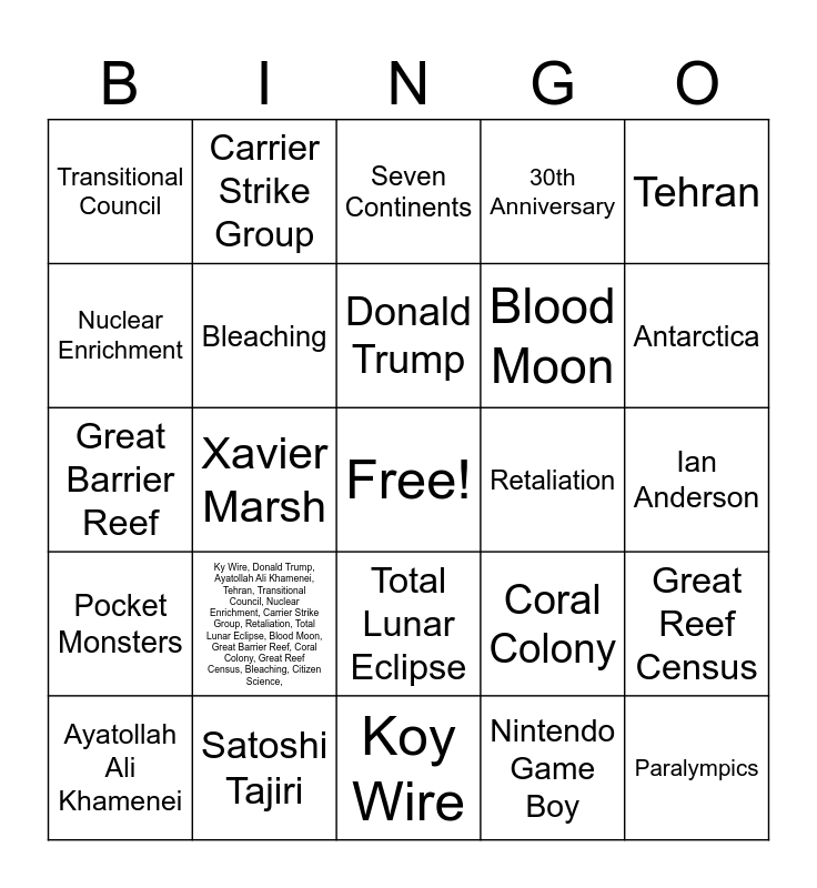 This bingo card has a free space and 25 words: Ky Wire, Donald Trump, Ayatollah Ali Khamenei, Tehran, Transitional Council, Nuclear Enrichment, Carrier Strike Group, Retaliation, Total Lunar Eclipse, Blood Moon, Great Barrier Reef, Coral Colony, Great Reef Census, Bleaching, Citizen Science,, Koy Wire, Donald Trump, Ayatollah Ali Khamenei, Tehran, Transitional Council, Nuclear Enrichment, Carrier Strike Group, Retaliation, Total Lunar Eclipse, Blood Moon, Great Barrier Reef, Coral Colony, Great Reef Census, Bleaching, Citizen Science, Ian Anderson, Seven Continents, Antarctica, Xavier Marsh, Paralympics, Satoshi Tajiri, Pocket Monsters, 30th Anniversary and Nintendo Game Boy.