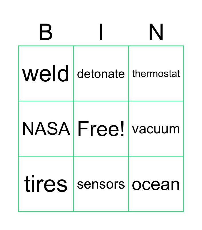 This bingo card has a free space and 8 words: vacuum, thermostat, detonate, tires, weld, ocean, NASA and sensors.