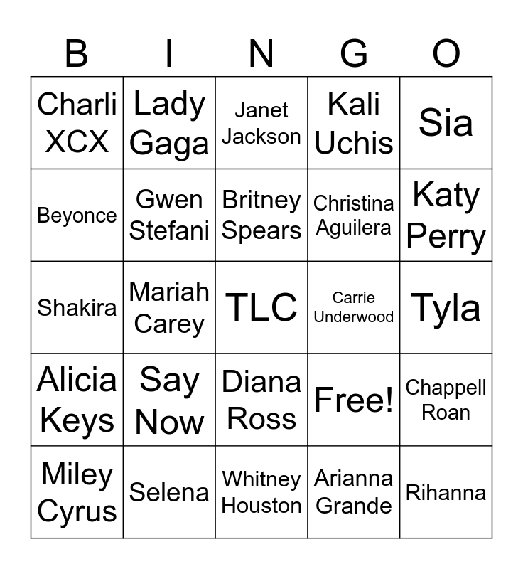 This bingo card has 27 words: Free!, Rihanna, Christina Aguilera, Whitney Houston, Beyonce, Janet Jackson, Lady Gaga, Alicia Keys, Carrie Underwood, Chappell Roan, Shakira, Kali Uchis, Miley Cyrus, Selena, Katy Perry, Destiny's Child, Gwen Stefani, Britney Spears, Say Now, Charli XCX, Tyla, Arianna Grande, Mariah Carey, TLC, Diana Ross, Sia and P!NK.