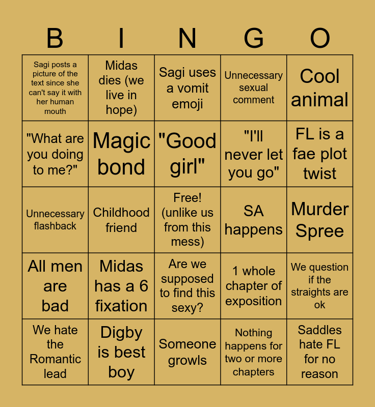 This bingo card has a free space and 45 words: Someone uses the C word, Saddles hate FL for no reason, A person is surprised FL is gold, We hate the Romantic lead, Nice person dies, Nothing happens for two or more chapters, Sagi uses a vomit emoji, Sagi screams Why, Cool animal, Digby is best boy, Unnecessary sexual comment, SA happens, Are we supposed to find this sexy?, Midas has a 6 fixation, "You are mine", Someone growls, FL gets a dragon, Unnecessary flashback, NO! DON'T GO BACK TO MIDASS!, FL is a fae plot twist, Midas dies (we live in hope), Women are degraded, FL is a "Pet", Sagi posts a picture of the text since she can't say it with her human mouth, Sagi gives up the book, Murder Spree, "Who is this again?", Dumb name, 1 whole chapter of exposition, All men are bad, 'Puppet' metaphor, We question if the straights are ok, Sagi is actually enjoying herself, FL turns someone into gold, Plot twist we saw coming a mile off, Childhood friend, Forced Proximity, First Love, Secret Identity, "Good girl", "What are you doing to me?", "I'll never let you go", Weird attraction, Magic bond and Did you know it's snowing?.