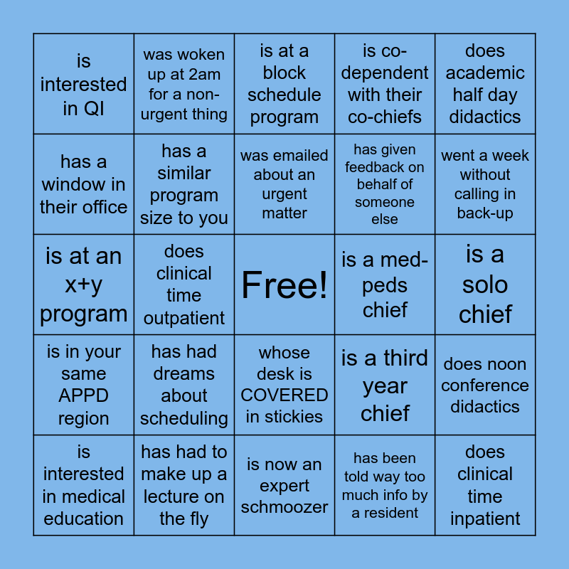 This bingo card has a free space and 24 words: has had dreams about scheduling, has had to make up a lecture on the fly, was emailed about an urgent matter, is interested in medical education, does academic half day didactics, is interested in QI, has a window in their office, was woken up at 2am for a non-urgent thing, is a med-peds chief, whose desk is COVERED in stickies, has given feedback on behalf of someone else, is at an x+y program, is a third year chief, does noon conference didactics, has a similar program size to you, has been told way too much info by a resident, is a solo chief, is at a block schedule program, went a week without calling in back-up, does clinical time outpatient, does clinical time inpatient, is in your same APPD region, is co-dependent with their co-chiefs and is now an expert schmoozer.